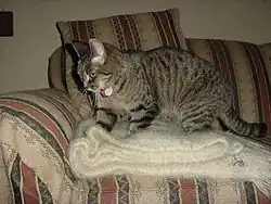 Many theories exist that explain why cats knead.[3] Kneading may have an origin going back to cats' wild ancestors who had to tread down grass or foliage to make a temporary nest in which to rest. Alternatively, the behavior may be a remnant of a newborn's kneading of the mother's teat to stimulate milk secretion.[4] Kneading may also be a form of communication between owner and feline: because of the action's maternal connection, the behavior may be a communication of affection towards the cat's human companion.[5]