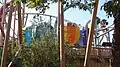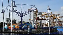 Motorcycle Chase, a modernized steeplechase rollercoaster built in 1976 by Arrow Development, featured single motorbike-themed vehicles racing side-by-side, each on one of four parallel tracks, launched together.[30] One or two riders straddled each "Indian motorcycle" attraction vehicle. The tubular steel monorail track closely followed dips and bumps in "the road" and tilted to lean riders about the curves. Gasoline Alley, an electric steel-guide rail car ride below, was built together and intimately intertwined, which enhanced ride-to-ride interaction thrill value.[33] Rider safety concerns of the high center of gravity coupled with the method of rider restraints caused it to be rethemed Wacky Soap Box Racers with vehicles themed to look like soap box racers, each seating two riders, strapped in low (nearly straddling the track), surrounded by the close-fitting car sides, and the dips and bumps of the track were straightened flat in 1980. Motorcycle Chase/Wacky Soap Box Racers was removed in 1996 for a dueling loop coaster Windjammer Surf Racers and now Xcelerator, a vertical launch coaster, takes its place.
