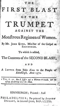 - The First Blast of the Trumpet Against the Monstruous Regiment of Women (1558)
