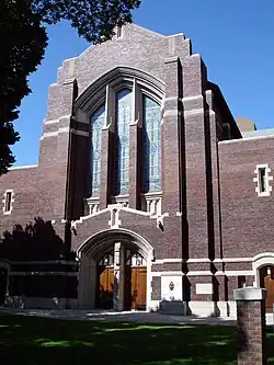 Architects Brown and Vallance of Montreal designed the present-day church in the Collegiate Gothic style. Construction started in 1912 and was completed in 1914.[3] The two-storey building is made of dark red brick walls, features stained-glass windows, and has seating 1,200.[1] The acoustic qualities of the church have made it a regular venue for various social and cultural events, including chamber music performances.[3] The Institute for stained glass in Canada has documented the stained glass at Knox United Church [4]