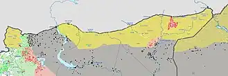 ![]() Territories controlled by the YPG, ISIL, the Syrian Army, Free Syrian Army, or contested in northern Syria, as of late June 2015 | |||||||