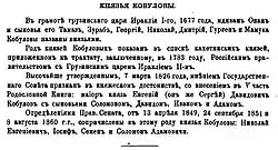 The family was subsequently established in the Kingdom of Kakheti and confirmed as princes (knyaz Kobulov, Кобуловы) of the Russian Empire in 1826.