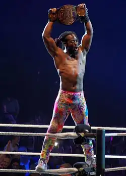 On June 25, 2008, Kingston was drafted to the Raw brand, as part of the WWE Supplemental Draft.[36] In his first match as a member of Raw roster, and first championship match in WWE, he defeated Chris Jericho for the Intercontinental Championship at Night of Champions, after Shawn Michaels, whom Jericho was feuding with, attacked Jericho's manager Lance Cade.[37] The win made him the first African-born wrestler to hold a championship in World Wrestling Entertainment.[38] Kingston held the championship until SummerSlam, where he and Women's Champion Mickie James both lost their championships in an intergender "winner take all" tag team match to Santino Marella and Beth Phoenix.[39]