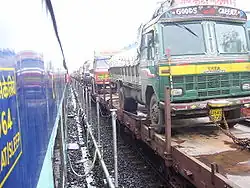 RORO means Roll-on/roll-off, where loaded trucks are directly carried by railway wagons to their destination. The first ever RO-RO service in India was run by Konkan Railway. Konkan Railway passes through tough terrains of India. There is NH-66 passing through same route. Truck drivers find it extremely difficult to drive loaded trucks through Western Ghats, undulating surfaces, narrow roads and poor road and weather conditions. The KRC came with concept of RORO, where loaded trucks are moved on wagons and are travelled by train. This has helped in saving fuel, decrease in wear and tear of lorries (trucks), relief to drivers of driving in extreme conditions, and faster arrival of the trucks to destination.[8] This also helps decrease road congestion and pollution. This concept has been beneficial for both truck operators and KRCL.