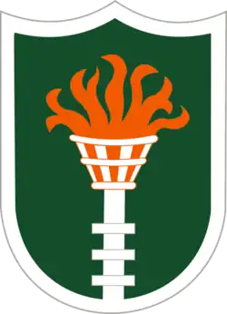 The most common unit insignia worn by KComZ personnel depicted an orange flame in a white bracket at the centre of a green shield. A less common variant, also shaped like a shield, depicted the letters KCOMZ diagonally in white on a green background.