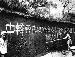 In 1939, the Korean Volunteer Army (KVA), was formed in Yan'an, China.[2] The two individuals responsible for the army were Kim Tu-bong and Mu Chong. At the same time, a school was established near Yan'an for training military and political leaders for a future independent Korea. By 1945, the KVA had grown to approximately 1,000 men, mostly Korean deserters from the Imperial Japanese Army. During this period, the KVA fought alongside the Chinese communist Northeast Anti-Japanese United Army from which it drew its arms and ammunition. After the defeat of the Japanese, the KVA accompanied the Chinese Communist Party forces into eastern Jilin, intending to gain recruits from ethnic Koreans in China, particularly from Yanbian, and then enter Korea.[3]