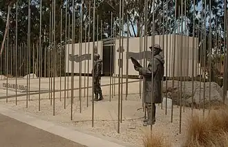 On both sides of the memorial are figures representing Australian soldiers, sailors and airmen who served in Korea. Battlefield boulders are set in fields of stainless steel poles which symbolise those who died.