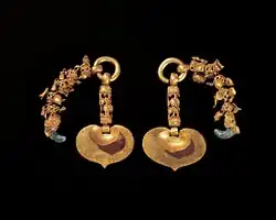 The tradition of Korean jade carving dates back to Neolithic finds along the Namgang river basin in Gyeongju.[1][2][3] Jade rings and accessories made from both nephrite and jadeite were worn by the higher classes of society, especially women, from the three kingdoms period and reached their peak in the Joseon dynasty, the golden age of jadework.[1] Carved jade artifacts found in Silla dynasty tombs appear to be made from jade originating from Japan and Taiwan, suggested sea trade of jade existed prior to the 5th century AD.[2][4] Korean jadework often includes Buddhist motifs, cicadas, and small peanut-shaped or comma-shaped good luck talismans (called magatama or gogok), as well as larger-scale architectural pieces.[3][4] A gold crown featuring 58 hanging jade pendants and a gold girdle with 13 jade pendants were both found in the Silla-era tomb of an unknown king, called Cheonmachong (or 'sky horse tomb'), first excavated in 1973.[2][3]