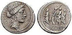 The reverse depicts three togate figures walking left—two carrying fasces lictoriae over their shoulders—interpreted as a Roman consul flanked by two lictors, likely inspired by a denarius issued by Marcus Junius Brutus in 54 BC. The obverse shows an eagle standing on a scepter, clutching a wreath in its claw, a design similar to that found on coins of Pomponius Rufus.[1][2]