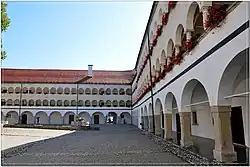 A former monastic complex, which was burned by the Partisans in World War II,[10][11] has been renovated and now houses the Božidar Jakac Gallery, an art gallery with a sculpture park and a permanent exhibition of works by Božidar Jakac. It is dominated by the Early Gothic abbey church built in 1234.[12]