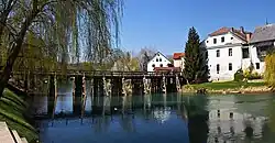 Kostanjevica na Krki (pronounced [kɔˈstàːnjɛʋitsa na ˈkə̀ɾki] ⓘ; also Kostanjevica ob Krki, German: Landstraß[2]) is a small town in the historic Lower Carniola region of southern Slovenia. It is the seat of the Municipality of Kostanjevica na Krki. Today it is part of the Lower Sava Statistical Region.[3] It is located in the northern foothills of the Gorjanci Hills near the border with Croatia. The center of the settlement is on an island in the Krka River, and it is also promoted as the "Venice of Lower Carniola" in Slovenian (Slovene: Dolenjske Benetke).