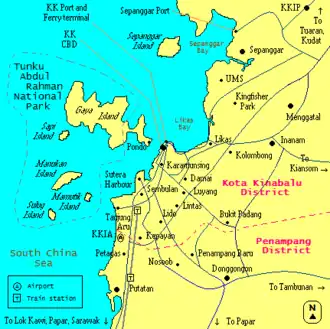 The city is defined within the borders of what is the district, formerly the municipality, of Kota Kinabalu. With an area of 351 square kilometres, it is the smallest but the most populous district in Sabah.[35] It encompasses Tanjung Aru and Kepayan in the south, up to Telipok and Sepanggar in the north. The urban expanse of the city however extends into the district of Penampang[36] on the south of the city border, which includes the towns of Donggongon and Putatan. The combined area of Kota Kinabalu District and the contiguous built up areas in Penampang and Putatan is known as Greater Kota Kinabalu.[37] The district of Penampang has an area of 466 square kilometres, and is administered by Majlis Daerah Penampang (Penampang District Council).[38]
