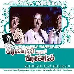 Kothigalu Saar Kothigalu (transl. Monkeys, sir, monkeys) is a 2001 Indian Kannada comedy film directed by Rajendra Singh Babu. The film stars Ramesh Aravind, S. Narayan, Mohan, Prema, Tara and Urvashi in the lead roles. This is the second film in the Saar series directed by Babu[1] and was released on 28 December 2001 and received generally positive reviews from the critics and turned out to be a box office hit. It completed a 100-day run in theatres.[2] The film was remade in Telugu as Sandade Sandadi (2002), in Hindi as Shaadi No. 1 (2005) and in Bangladeshi Bengali as Tomakei Khujchi (2008).