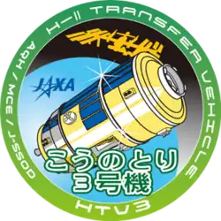 Kounotori 3 (Japanese: こうのとり3号機; English: "white stork" [2]), also known as HTV-3, was the third flight of the Japanese H-II Transfer Vehicle. It was launched on 21 July 2012 to resupply the International Space Station (ISS) aboard the H-IIB Launch Vehicle No. 3 (H-IIB F3) manufactured by Mitsubishi Heavy Industries (MHI) and JAXA.[3] Kounotori 3 arrived at the ISS on 27 July 2012, and Expedition 32 Flight Engineer and JAXA astronaut Akihiko Hoshide used the International Space Station's Canadarm2 robotic arm to install Kounotori 3, to its docking port on the Earth-facing side (nadir) of the Harmony module at 14:34 UTC.[4]