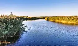 With a drop of 0.5 m per km, the river is gently flowing. The width of its valley is 3.5 km. The right bank is high, up to 60 m in places, and cut by short but deep ravines. The flat left bank is lower, less than 30 m high and gently cut by tributary streams.