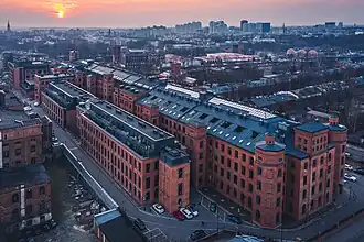 Starting from the 1870s, another Scheibler factory complex began to grow - on an unprecedented scale - "Księży Młyn" (according to the design by Hilary Majewski - although this attribute raises serious doubts[1]), with the largest cotton spinning building in Łódź ( 207 m long), a housing estate for workers, residential houses Families, the so-called factory shop consumer, fire brigade, hospital, school, palace complex and park with a pond. Currently, this compact residential and industrial district, which is an unusual "city in the city", is one of the most interesting industrial monuments in the world. The factory complex at Księży Młyn - also known as Pfaffendorf in German - is the first assumption on this scale, later unsurpassed, assuming the characteristic layout for Łódź: a factory - a residence - a housing estate. This is one of the best implementations of this kind, not only in Poland, but also in Europe.[2] As a complex, it has been entered in the register of monuments, and efforts have been made for several years to make it a UNESCO World Heritage Site.
