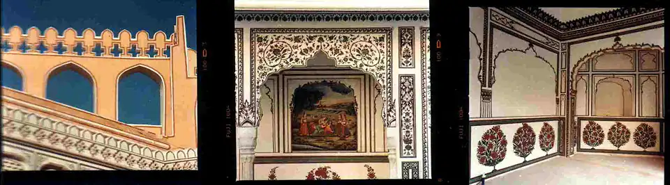 The city of Kuchaman spread out at the foot of the hill crowns the Kuchaman Fort. Kuchaman City is adorned with a plethora of magnificent havelis built in the Māru-Gurjara architecture was developed during Pratihara dynasty. Stepping into this plush city, one cannot help but be mesmerized by looking at these amazing structures adorned with colorful frescoes and artistic murals. Its royal charm is added to the spiritual aura of its holy temples. Located in the Didwana-Kuchaman district of Rajasthan, this city has maintained its traditions over the years. From exuberant festive occasions to the daily hustle and bustle of local markets, Kuchaman City offers an experience to remember. The grandeur of the royal heritage of the city of Kuchaman can be experienced with a visit to the 8th-century Kuchaman Fort. Perched atop a rock at an altitude of about 1,000 feet, the fort is known not only for its historical significance but also for its architectural finesse and aesthetic appeal. Its major attractions include Jal Mahal, Sheesh Mahal and Sabha Prakash.[30] Shahi Bazaar and Meena Bazaar sell traditional clothes.