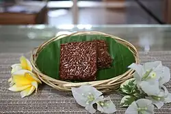 In Brunei, this confection is known as wajid. It is prepared by steaming rice, which is then mixed with coconut milk and caramelized sugar.[8] It is finally wrapped in nyirik leaves and fastened with a pin made with the midrib of oil palm leaves,[9] in the same manner as wrapping kelupis. It is regarded as a traditional food which has been passed down from generation to generation.[10][11]