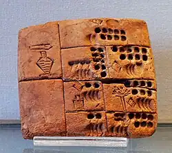 Writing in ancient Sumer was a time-consuming activity known to few. For this reason, writing was mainly used to keep necessary economic records. Literacy in Uruk was also likely limited at the time.[1] A clay tablet detailing a trade transaction contains one of the first examples of rebus writing.[2] It reads "28,086[a] measures barley 37 months Kushim." This may be interpreted as having been signed by "Kushim".[1][4] As of 1993, Kushim's name was known to appear in 18 separate Proto-cuneiform clay tablets from the period.[5][6]