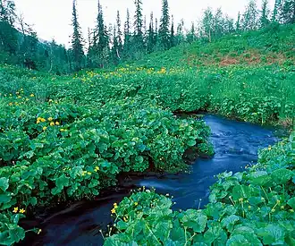 Kuznetsk Alatau is located in the Sayan montane conifer forests ecoregion. This ecoregion covers the middle-elevations of the highest mountains in the Altai-Sayan mountain range of central Asia. It lies between the Siberian taiga to the north, and the Mongolian steppe to the south. The ecoregion is characterized by mountains desiccated with river valleys, high levels of precipitation, and high biodiversity. Flora is generally dependent on the elevation and terrain, with forest having three main subzones based on altitude: light needle-leaf sparse taiga, dark needle-leaf taiga, and dark taiga.[3]