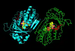 ![]() Structure of the kynurenine 3-monooxygenase dimer, generated from 4J34.[1] One monomer is depicted in cartoon format (cyan) and the second monomer is displayed in ribbon format (green). The flexible linker regions (residues 96-104) are colored red. Flavin adenine dinucleotide (FAD) is shown as spheres color-coded according to atom type. | |||||||||