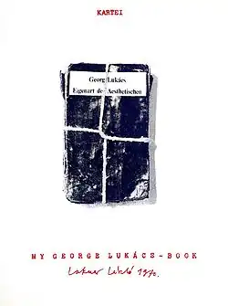 In his conceptual art Lakner applies various methods of artistic transformation of literature as well as language. A major work in 1970 used a book on aesthetics, written by the Hungarian philosopher George Lukács, who signed it for him. Lakner tied it shut using a piece of string. He then placed the laced book on his studio wall, photographed it and then transformed it into a screen printed image.[51] This work (and its novel method of fabrication) was exhibited in 1972 at the Venice Biennale in the International Pavilion. Lakner continued working with this process by lacing other books,[52] as well as creating photorealistic paintings of such situations.