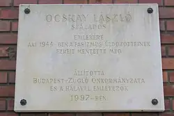 His story, like so many others, was forgotten for decades in Hungary. In the 1990s people rescued by him initiated a memorial in his honor. It was eventually erected in October 2008 in the City Park of Budapest,[7] where in July 2015 a street was also named after him. On 23 October 1996 he was given a posthumous gold medal by President of Hungary Árpád Göncz. He was awarded the Righteous Among the Nations title by Yad Vashem in 2002. In 2007 a 70-minute documentary film was made with the recollections of survivors by the title Captain László Ocskay, the Forgotten Hero.[8] In 2008 a documentary book was published by historian Szabolcs Szita: The Story of László Ocskay in view of saving Jews in the Holocaust.[9] In October 2019 the community of ELTE Radnóti Miklós Secondary School created an interactive theater play, Being Human,[10] recalling life at the number 101/359 battalion using the original venue of the events.