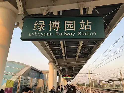 Lüboyuan railway station (Chinese: 绿博园站; pinyin: Lǜbóyuán zhàn; lit. 'Green Expo Garden station') is a railway station on the Zhengzhou–Kaifeng intercity railway. The station is 2 km north of the Green Expo Garden in Zhongmu County, Zhengzhou, Henan, China.