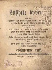 Lühhike öppetus (Estonian for Brief Instruction), by modern orthography 'Lühike õpetus', was the first periodical publication in Estonian. Edited by Dr. Peter Ernst Wilde and printed for a short while in 1766–1767, it described various simple medical techniques intended to be usable in the field by peasants.