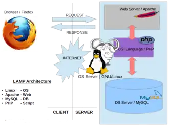 A high-level overview of LAMP's determining components (Firefox serves just as a browser example.)