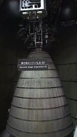 The LE-5 liquid rocket engine and its derivative models were developed in Japan to meet the need for an upper stage propulsion system for the H-I and H-II series of launch vehicles. It is a bipropellant design, using LH2 and LOX. Primary design and production work was carried out by Mitsubishi Heavy Industries.[1] In terms of liquid rockets, it is a fairly small engine, both in size and thrust output, being in the 89 kN (20,000 lbf) and the more recent models the 130 kN (30,000 lbf) thrust class. The motor is capable of multiple restarts, due to a spark ignition system as opposed to the single use pyrotechnic or hypergolic igniters commonly used on some contemporary engines. Though rated for up to 16 starts and 40+ minutes of firing time, on the H-II the engine is considered expendable, being used for one flight and jettisoned. It is sometimes started only once for a nine-minute burn, but in missions to GTO the engine is often fired a second time to inject the payload into the higher orbit after a temporary low Earth orbit has been established.