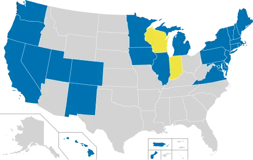 In 1962, beginning with Illinois, states began to decriminalize same-sex sexual activity,[7] and in 2003, through Lawrence v. Texas, all remaining laws against same-sex sexual activity were invalidated. In 2004, beginning with Massachusetts, states began to offer same-sex marriage, and in 2015, through Obergefell v. Hodges, all states were required to offer it. In many states and municipalities, LGBTQ Americans are explicitly protected from discrimination in employment, housing, and access to public accommodations. Many LGBTQ rights in the United States have been established by the United States Supreme Court, which invalidated state laws banning protected class recognition based upon homosexuality, struck down sodomy laws nationwide, struck down Section 3 of the Defense of Marriage Act, made same-sex marriage legal nationwide, and prohibited employment discrimination against gay and transgender employees. LGBTQ-related anti-discrimination laws regarding housing and private and public services vary by state. Twenty-three states plus Washington, D.C., Guam, and Puerto Rico outlaw discrimination based on sexual orientation, and twenty-two states plus Washington, D.C., outlaw discrimination based on gender identity or expression.[8] Family law also varies by state. Adoption of children by same-sex married couples is legal nationwide since Obergefell v. Hodges.[9][10] According to Human Rights Campaign's 2024 state index, the states with the most comprehensive LGBTQ rights legislation include Vermont, California, Minnesota, Virginia, Massachusetts, Rhode Island, Maryland, New Mexico, Washington, Colorado, New York, Illinois, Oregon, Maine, Hawaii, and New Jersey.[11]