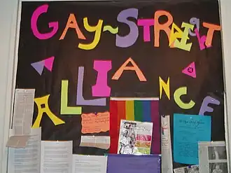 Though the times and places of the student movement vary, the goals are often similar including: abolishing sodomy laws, equality on campuses for LGBTQ students,[2] increasing money for HIV/AIDS research,[3] the legalization of same-sex marriage,[4] to prevent the bullying and suicide of LGBT youth, and gain visibility for LGBTQ people. LGBT student organizations today have started to involve research to improve the understanding of basic activism ideas. Using historical research as a source to identify and differentiate successful approaches. The identities of student activists and their involvement tends to shape the different organizations across campuses.[5] The student movements have not always been successful in their goals, but they have been able to bring visibility to the LGBTQ community in their area as well as working to promote equality for a better future for their community.[6]