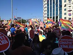 In Turkey, everyone has the constitutionally protected right to hold a peaceful protest without prior permission, so long as the topic of the protest is not explicitly banned by law.[58] Even though there are not any laws explicitly forbidding LGBT-related protests, the Istanbul Pride parade in June 2015, which overlapped with the Muslim holy fasting month of Ramadan, was banned by the Istanbul governorship hours before the event over "security concerns". Soon after, it was shut down through police intervention for the first time in its 13-year history. The parade had taken place the previous year during Ramadan without issue.[59] In 2016, it was banned again and arrests were made as participants tried to hold the rally regardless of the prohibition.[60] It was banned again in 2017, and in 2018 it was banned again and arrests were made as participants tried to hold the rally regardless of the prohibition. It was banned again in 2019. In 2020, due to the COVID-19 pandemic, it was held online with no official interference.[61]