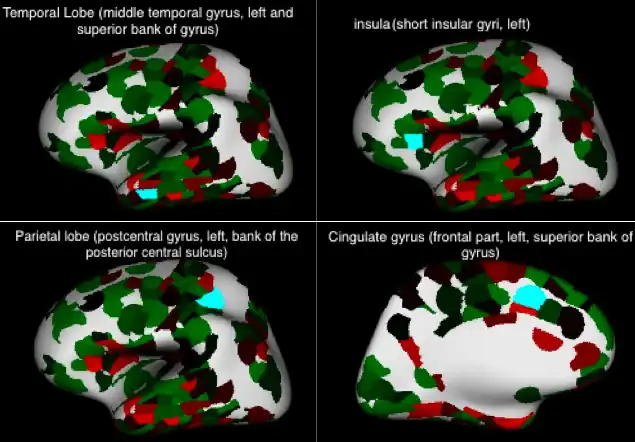 Seven key brain tissues express LOC105377021 according to an Allen Brain Atlas probe.[19] The temporal lobe, parietal lobe, cingulate gyrus, parahippocampal gyrus, and insula are five overarching regions of the seven brain tissues where expression was highlighted. The annotated figures below serve as fairly holistic representations of cranial expression in the context of LOC105377021. Light blue shaded regions posit more dense expression of LOC105377021, where as darker green and brighter red show less and least amounts of expression respectively. All seven expression areas, including the middle temporal gyrus, the short insular gyrus, the postcentral gyrus, the cingulate gyrus, the inferior temporal gyrus, the parahippocampal gyrus, and the superior temporal gyrus are depicted in Allen Brain Atlas profiles below.