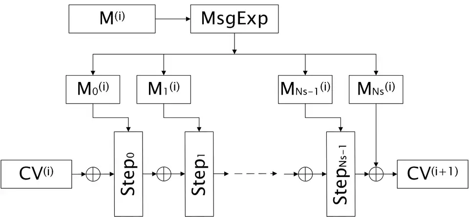 Updating of chaining variables by iteration of a compression function with message blocks.