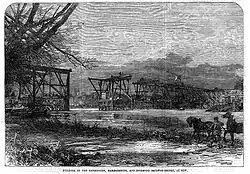 A few road bridges were built, the 1,000 feet (305 m) viaduct/bridge at Wandsworth over the Wandle (and the Surrey Iron Railway) and a deep cutting through about 0.5 miles (0.8 km) of Putney but via a flattish route, rural at the time, minimal other bridges, embankments or cuttings. Construction was swift and the line opened on 27 July 1846.[8]