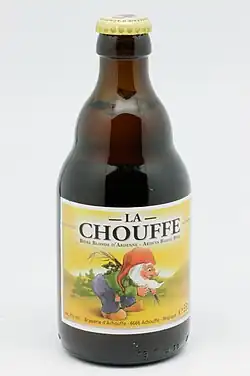 In the late 1970s, the two brothers-in-law, Pierre Gobron and Chris Bauweraerts, decided to create their own beer, in their own brewery. On the 27th of August 1982, with less than 5,000Fr, they made the first 49-litre mash tub. Based on the legend of the Ardennes, a gnome was chosen as the company logo of the brewery.[2] At first seen as a hobby, the Achouffe Brewery developed to such an extent that one after the other, Pierre and Chris decided work on it full time.[3] They then decided to expand to the Netherlands. Drinkers who regularly enjoy the beer can usually be recognized by their 'Chouffewillo hat'.[4] The annual La Grande Choufferie party, on the 2nd weekend of August, celebrates the birth of the Chouffe beer, in a convivial and musical atmosphere. In the late summer of 2006, Duvel Moortgat Brewery purchased the brewery.[5]