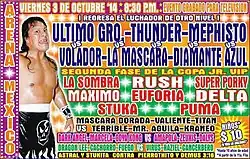 The La Copa Junior VIP tournament started on September 26, 2014 with half of the competitors facing off to determine the first finalist with Mephisto defeating Misterioso Jr., Shocker and finally Volador Jr. to earn a spot in the finals.[23][24] Brazo de Plata was originally scheduled to take part in the tournament, but was replaced by Ángel de Oro without any official explanation. The second qualifying block took place on October 3 to determine the second finalist. In the second round Los Ingobernables teammates La Sombra and Rush faced off after both won their first round match. To the surprise of everyone, and contrary to statements made before the tournament, the two decided not to fight each other at all and Rush gave the win to La Sombra. La Sombra faced Máximo in the block finals after Máximo defeated Puma and Stuka Jr. on his way to the finals. In the finals La Sombra was disqualified for kicking Máximo in the groin, costing him the match and allowing Máximo to advance to the tournament finals.[25][26] Euforia was the only competitor in the 2014 VIP tournament to have never competed in the La Copa Junior tournament before, despite it being openly acknowledge that he was the son of the original El Soberano, his son, the current Soberano, had not participated in a La Copa Junior tournament either at that point. On October 10 Máximo defeated Mephisto to win his first ever La Copa Junior tournament.[9]