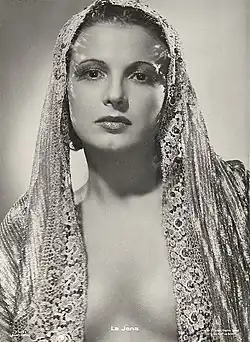 With Cochran's Streamline, La Jana toured throughout England and Scotland in 1934. In this show, she played a Spanish dancer. After her return to Germany, Truxa (filmed in 1936, released in 1937) made her a film star,[18] and from then on she appeared in one or more films almost every year. She represented an exotic, not typically German type of womanhood.[19][20][21][22] After she travelled to India with Richard Eichberg, millions admired her in the films she made there, Der Tiger von Eschnapur and Das indische Grabmal,[23] which also featured Frits van Dongen, Theo Lingen and Gisela Schlüter amongst others. In Menschen vom Variete and Es leuchten die Sterne, she appeared with Hans Moser and Grethe Weiser amongst others. She "initiate[d] the experiments of Nazi cinema in mimicking the Hollywood musical" and became the top dance and musical star in German films.[3]