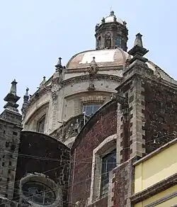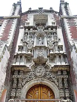 The main façade contains some aspects of the older churches that surround it, such as the cross layout, the relief work and window of the chorus, although new aspects such as estipite columns were introduced.[2] The façade also contains twelve medallions done in relief, each representing an apostle. Among the columns there are ten sculptures, five of which represent bishops, four represent popes and one represents a priest, each of which are identified as learned scholars of the Church.[2] The main portal is Churrigueresque style worked in "chiluca", a hard gray stone and flanked by two pillars.[2][3] The keystone of the central arch of this entrance is decorated with a medallion with the papal coat-of-arms covered by a series of volutes. Above this, there is a relief depicting the Holy Trinity with God the Father dressed as a pope.[1] The depiction of the Trinity is due to the church's patronage by a Trinitarian brotherhood originally formed by tailors.[2]