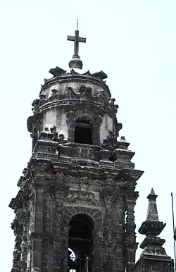 The tower rises to the side of the main façade.[2] It is topped by a very large sculpture of the papal crown, representing the supreme authority of the papacy. It contains estipite columns which were never finished and are unique among churches in Mexico City.[1][2]