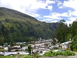 La Unión is a town in central Peru, capital of the province Dos de Mayo in the region Huánuco. The city lies over the Vizcarra River and is divided between two of the nine districts of the province, La Unión on the right bank and Ripán on the left bank. It has a regional hospital. Close to the city, over a flat highland or meseta (12,000 feet over sea level) is the old famed Inca city called Wanuku Pampa, Wanuku Marka or Wanuku Viejo. The most important festival is by the end of July and it is called "La Fiesta del Sol".[1]