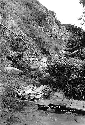 La Vida is the site of two separate water sources, a natural spring or seep known to indigenous people, and a water well drilled in 1893 as part of the exploration of the Brea-Olinda Oil Field.[4][5][6]