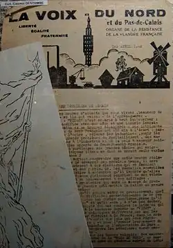Voix du Nord was one of the underground newspapers of the French Resistance founded in German-occupied France during World War II. The paper first appeared in Lille in April 1941 at a time when the region of Nord-Pas-de-Calais was being ruled by a German military government in Brussels.[2] The newspaper's tag-line described itself as the "Resistance organ of French Flanders."[2]