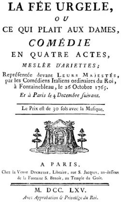 La fée Urgèle, ou Ce qui plaît aux dames (French pronunciation: [la fe yʁʒɛl u sə ki plɛ o dam], The Fairy Urgèle, or What Pleases Women) is an opéra comique (specifically a comédie mêlée d'ariettes) in four acts by the composer Egidio Duni. The libretto, by Charles-Simon Favart, is based on Voltaire's Ce qui plaît aux dames and Chaucer's "The Wife of Bath's Tale".
