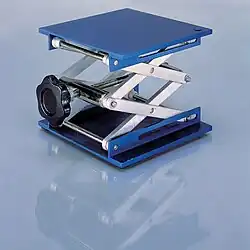 The manual laboratory scissor jack works mechanically by having a central screw connected to the central piece of metal between two layers of crossing metal pieces. The screw performs the same task as screws in hydraulic car lift, supporting the metal pieces in withstanding the oppressing weight.[1] Turning the screw increases and decreases the angle between the metal pieces, resulting in extension and contraction of the platform height.
