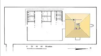 In the 17th century, Claude Sicard suggested that the Labyrinth may have been located at Hawara.[22] Two centuries later, in a volume of Description de l'Égypte (1821), Philippe Joseph Marie Caristie and Edme-François Jomard discussed the location of the Labyrinth in an extended consideration of the Hawara site; Eric P. Uphill has thus argued that Jomard and Caristie's chapter was consequently "the first published description of ... the Labyrinth site [that] distinguish[ed] the salient features [of the structure] correctly".[23][24] Subsequent works postulated that the ruins south of the Pyramid of Amenemhat III were in fact the remains of the Labyrinth, including brief reports by Howard Vyse and John Shae Perring (1842) and John Gardner Wilkinson (1843).[25][26][24]