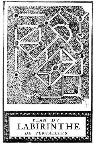 The layout of the maze was unusual, as there was no central goal, and, despite the five-metre-high (16 ft) hedges, allowed glimpses ahead.[6] Jean-Aymar Piganiol de La Force in his Nouvelle description du château et parc de Versailles et de Marly (1702) describes the labyrinth as a "network of allées bordered with palisades where it is easy to get lost." He continues: "At every turn you see a fountain decorated with delicate rocaille, and representing very simply a fable, the subject of which is indicated by a four-line inscription in gold letters on a bronze plate."[7]