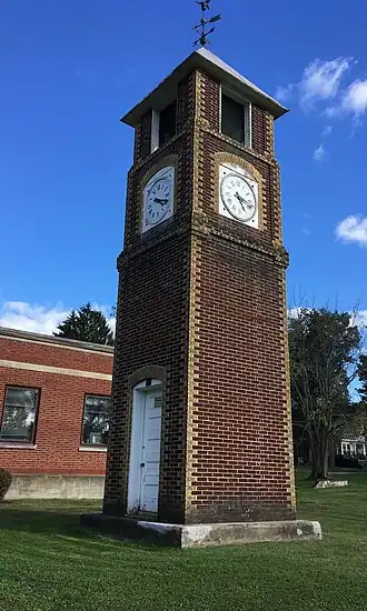Lacona Clock Tower is a historic clock tower located at Lacona in Oswego County, New York. It was built in 1925 and is a freestanding three-tier red brick tower with a square plan and pyramidal roof. The second stage features the working electric clock and third stage a belfry containing the village bell.[2]